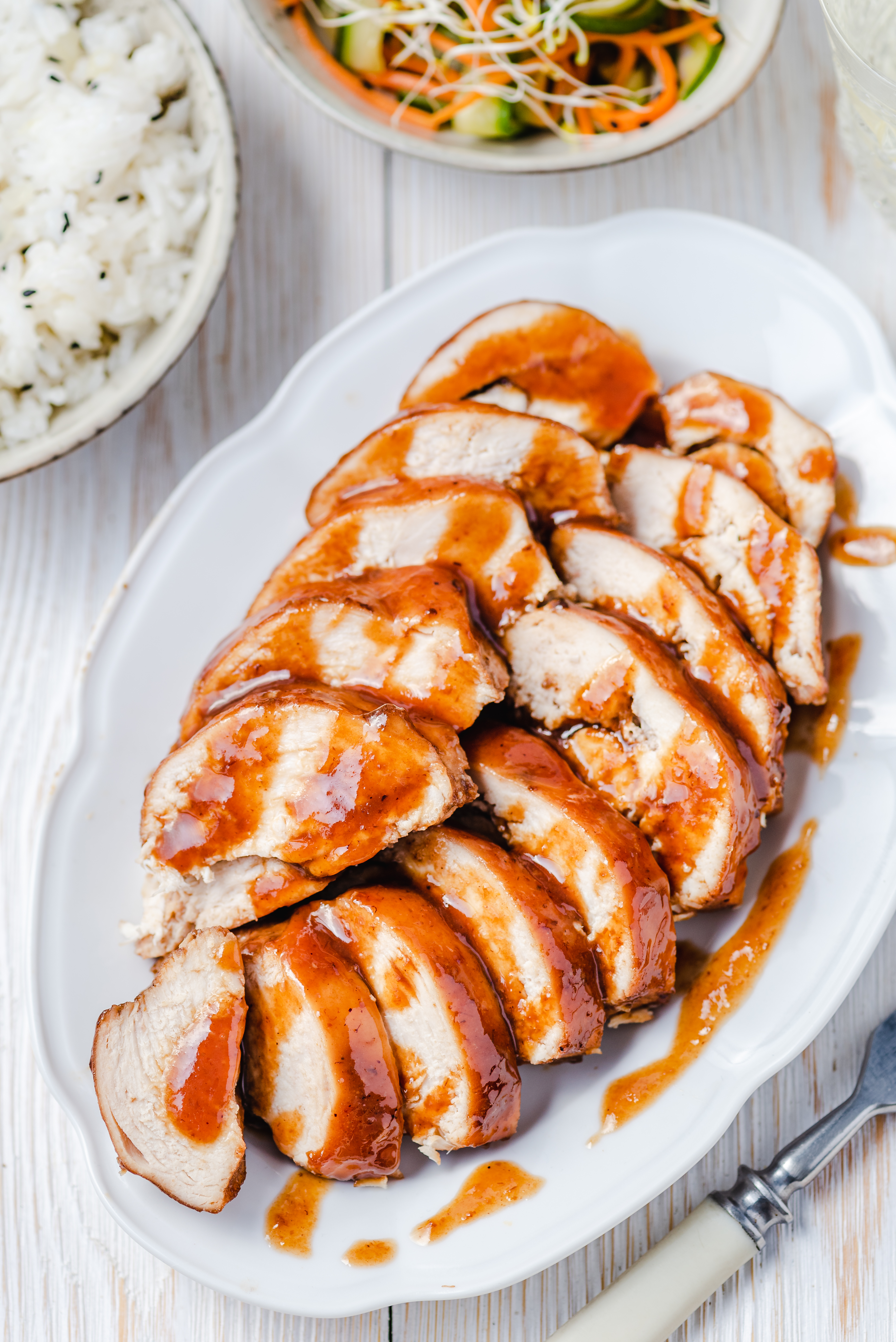 - Plasterki kurczaka podawać z sosem, ryżem sezamowym i orientalną sałatką.